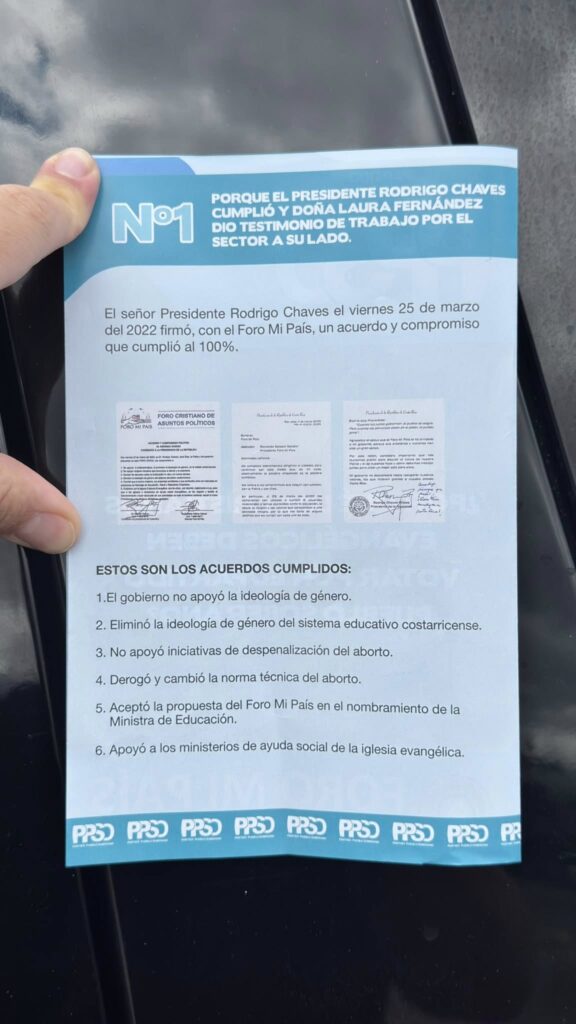 El documento también señala que Chaves cumplió otros acuerdos con el Foro Mi País, entre ellos no apoyar la ideología de género y eliminarla del sistema educativo costarricense, modificar la norma técnica del aborto y respaldar los ministerios de ayuda social de la iglesia evangélica.