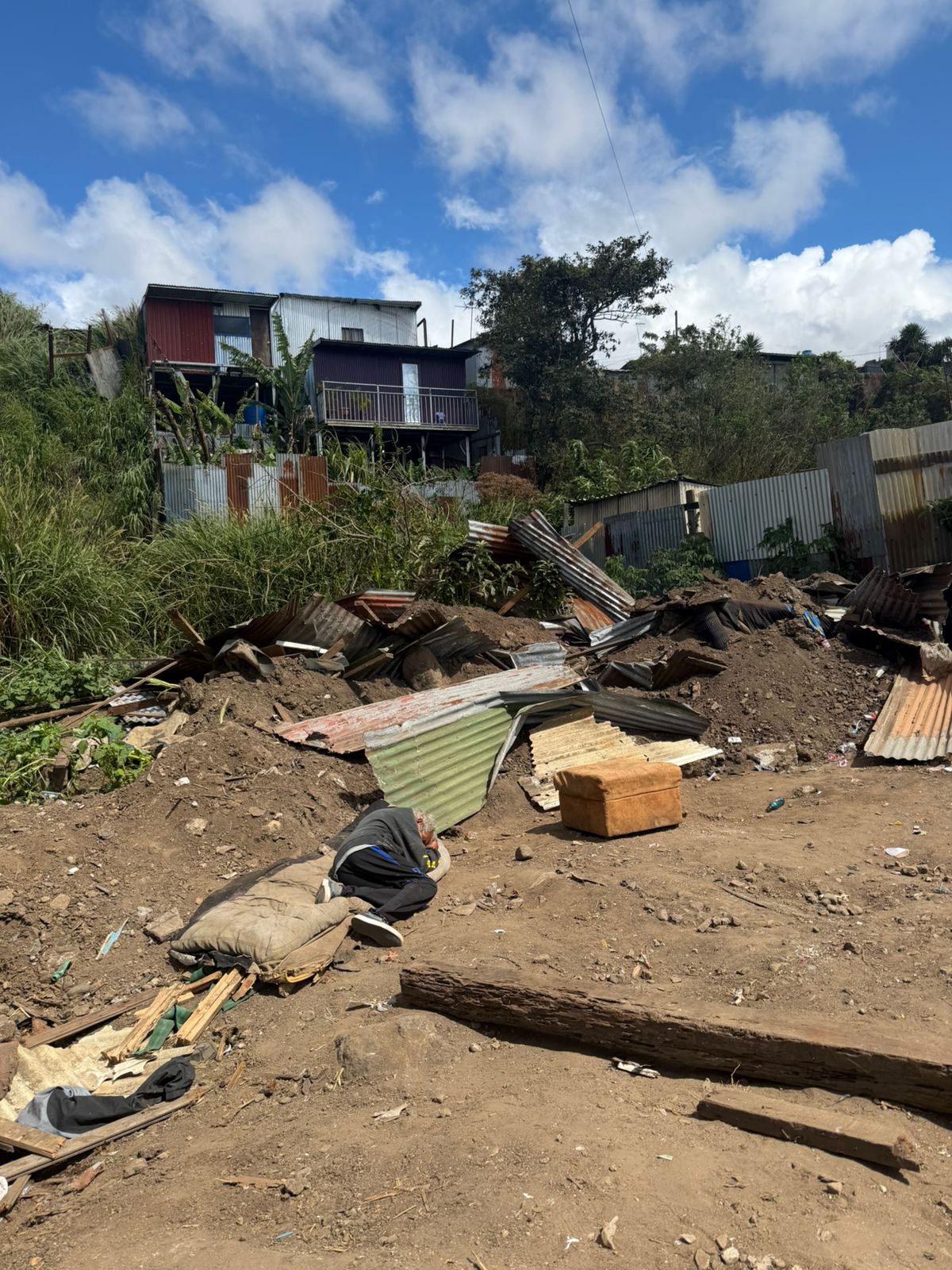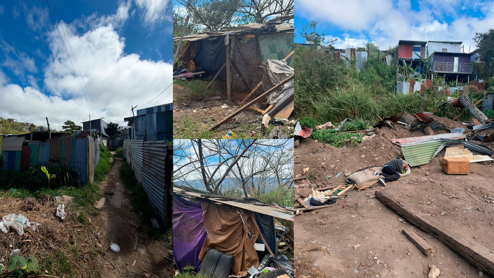 Durante el recorrido, este medio observó decenas de estructuras improvisadas: galeras, ranchos de madera y zinc, y en algunos casos construcciones hechas con colchas como paredes y láminas deterioradas como techo.