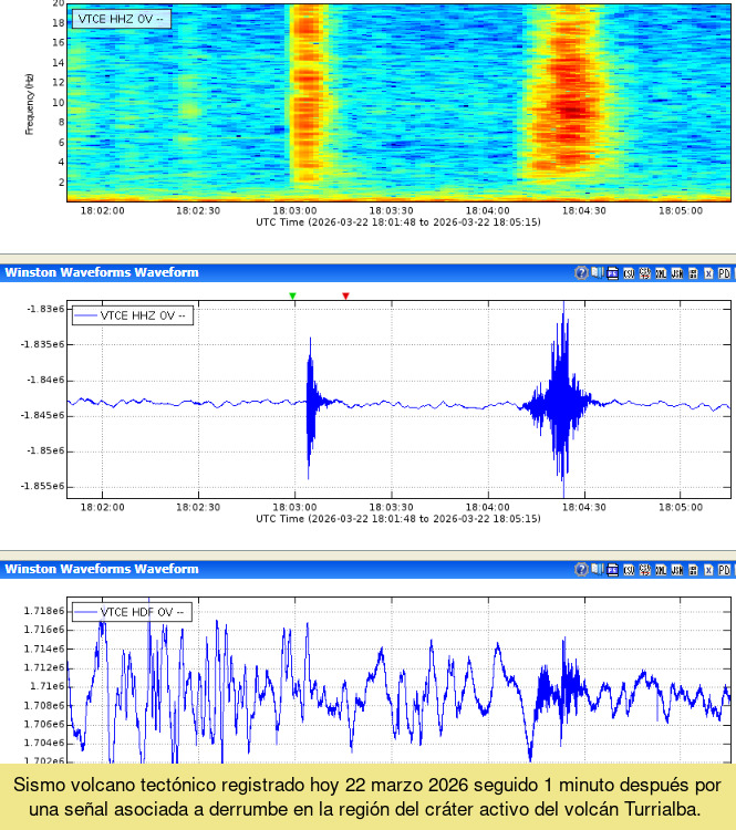 El volcán Turrialba registró este domingo, a las 12:03 p. m., un sismo en el interior de su cráter activo. Un minuto después se detectó otra señal asociada a un derrumbe en la misma zona.