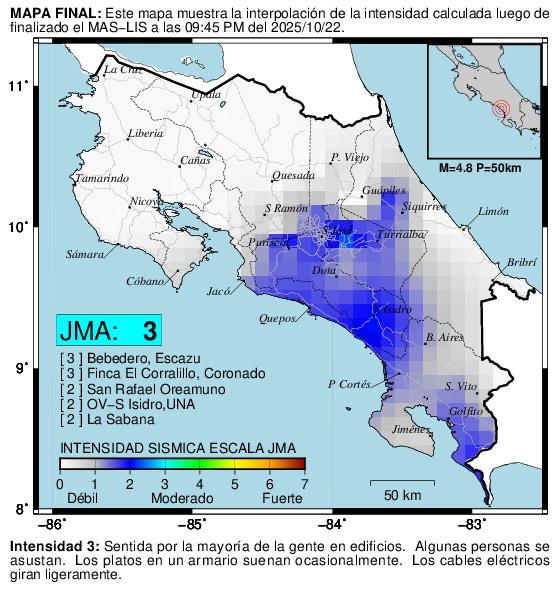 El mapa "de calor" muestra que fue sentido con mayor fuerza en la zona del Pacífico Central, la Gran Área Metropolitana y zonas del Caribe como Siquirres y Guápiles.