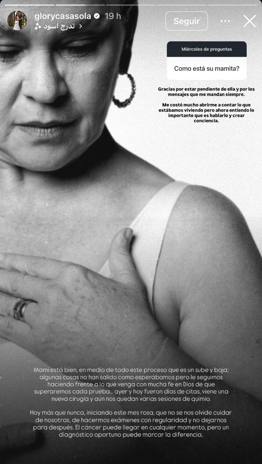 Por medio de una historia en su cuenta de Instagram, Casasola realizó una dinámica con sus seguidores a través de la conocida "cajita de preguntas". Entre las consultas que recibió estuvo: "¿Cómo está su mamita?". Ante ello, la comunicadora explicó que, aunque su madre ha atravesado un proceso lleno de altibajos, se encuentra bien.