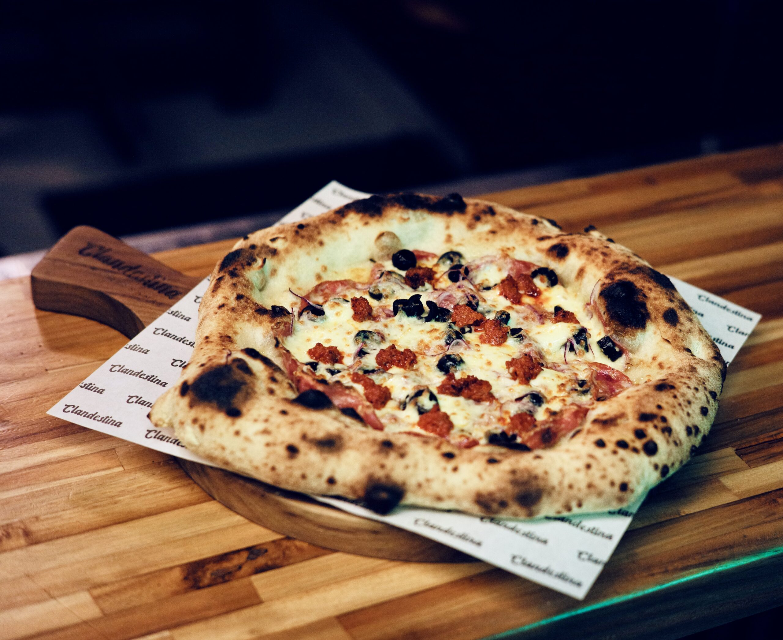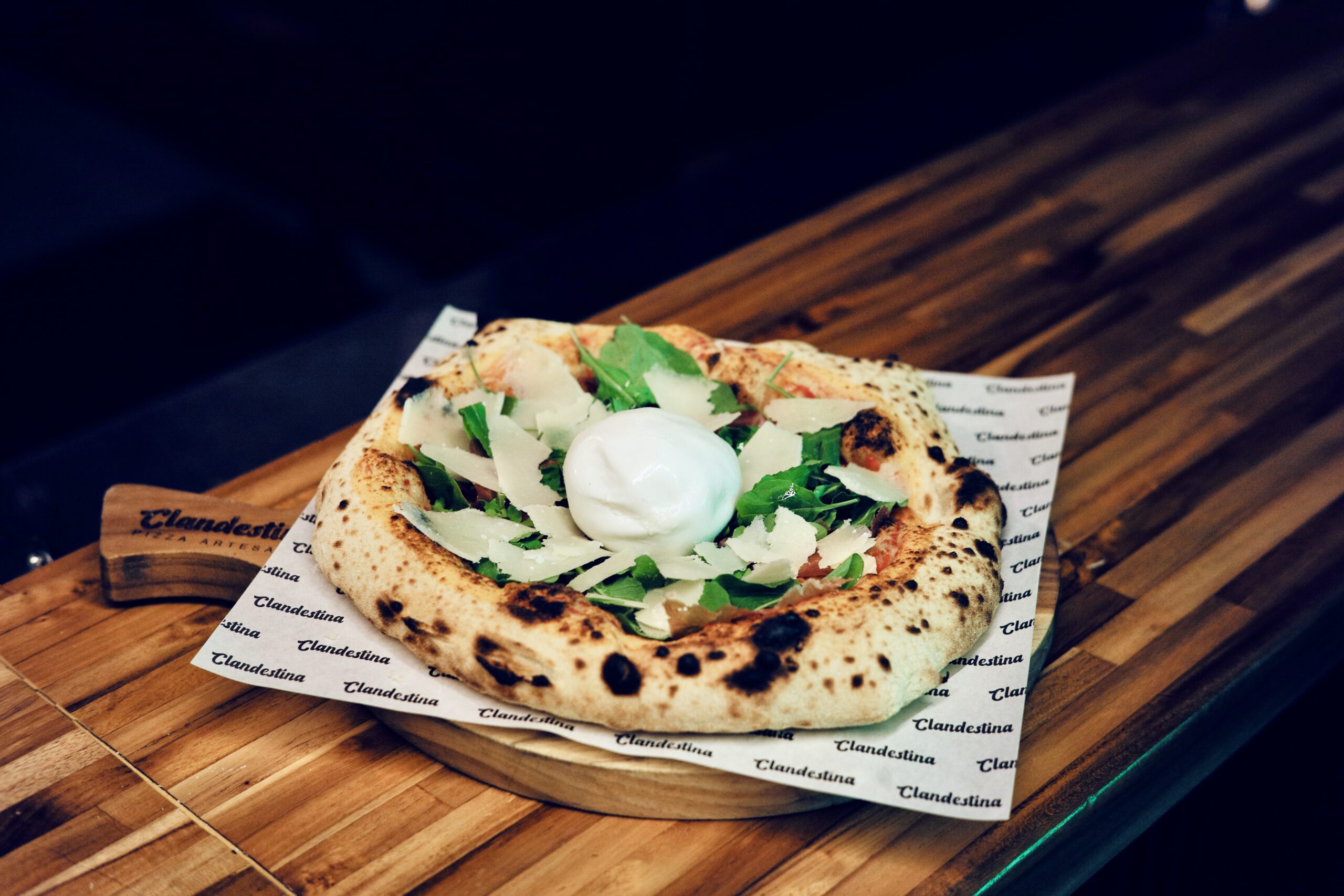 Oscura por fuera, cálida por dentro. Las paredes negras, la madera cruda y la luz tenue crean un espacio íntimo, casi secreto, donde lo importante es lo que llega a la mesa. Tiene alma de escondite, pero con detalles pensados para hacerte sentir en casa. En Clandestina todo te dice que lo que importa es comer bien y apreciar los sabores y el arte de hacer pizza.