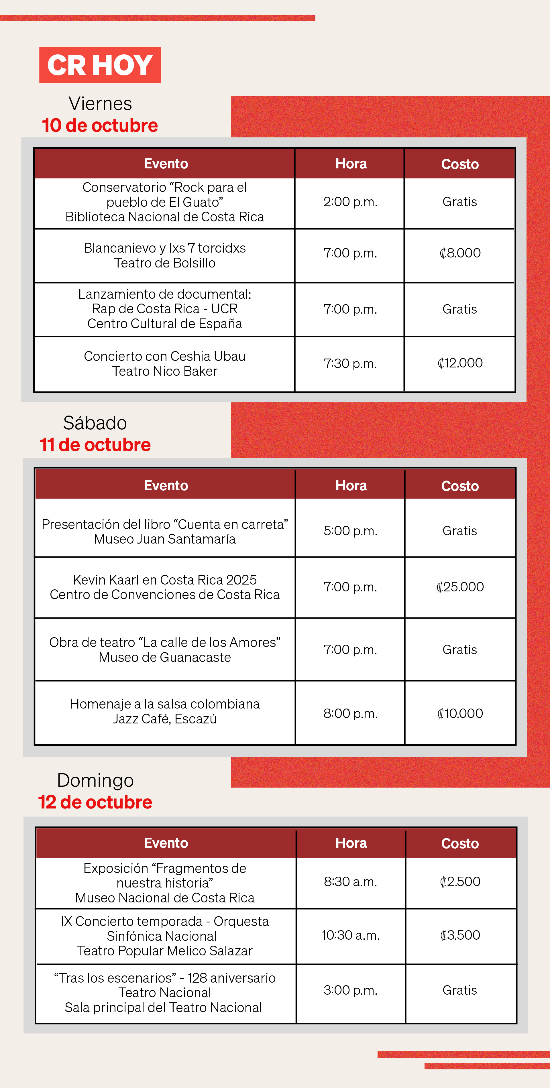 Este fin de semana, Costa Rica se llena de cultura. Hay tantas opciones que probablemente se preguntará a cuál asistir, porque todas prometen experiencias únicas: desde teatro y conciertos hasta exposiciones imperdibles. Acompáñenos a recorrer el país y descubrir una agenda diseñada para todos los gustos, ya sea que quiera disfrutar con amigos o compartir en familia.