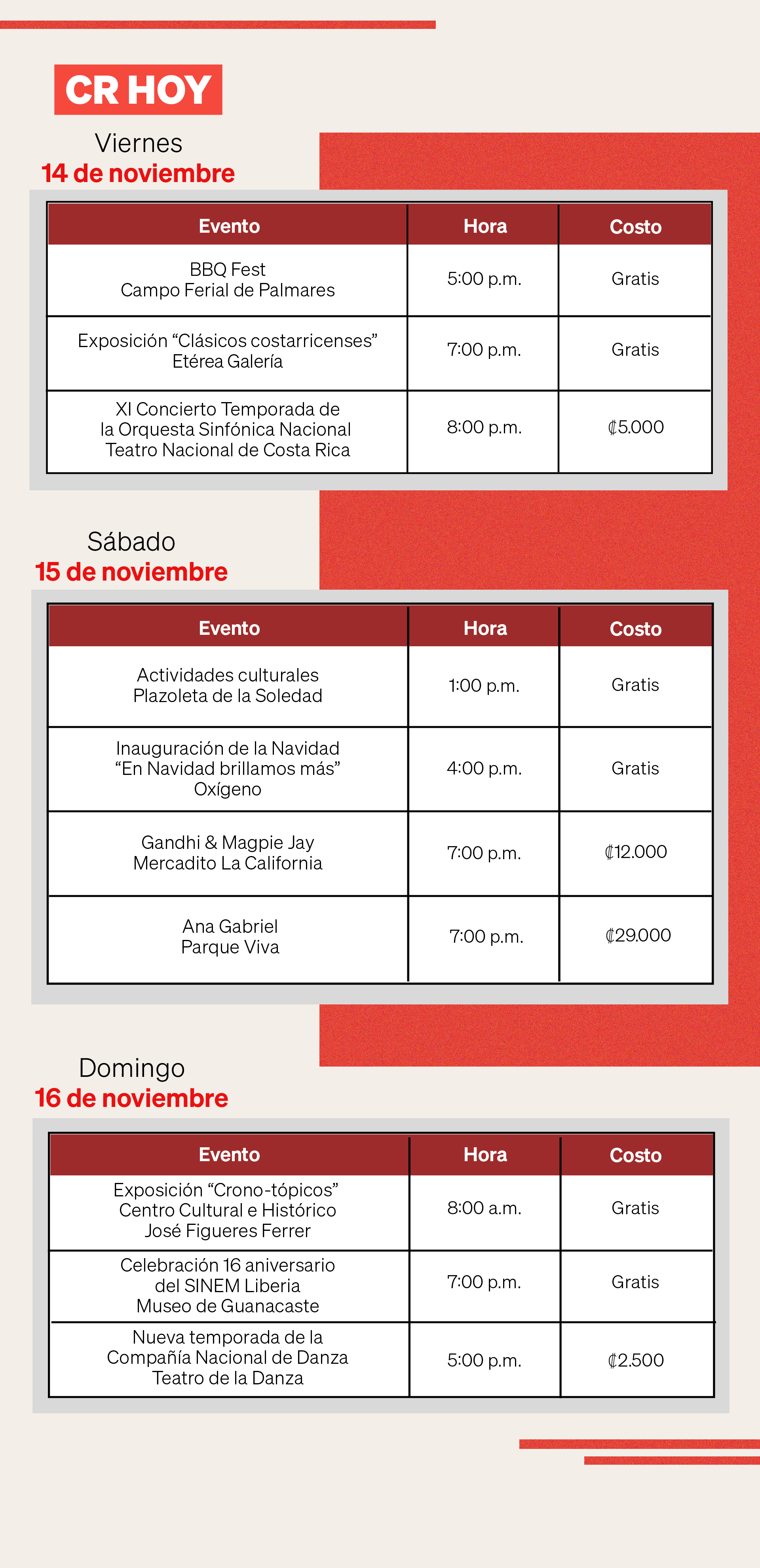 Ese mismo día, en el Museo de Guanacaste, se celebrará el 16 aniversario del SINEM de Liberia con actividades culturales a partir de las 7:00 p.m., también con acceso libre. Finalmente, la Compañía Nacional de Danza inaugurará su nueva temporada con un homenaje póstumo a la maestra Marta Ávila. La función será el domingo a las 5:00 p.m. en el Teatro de la Danza, con entradas desde ¢2.500.