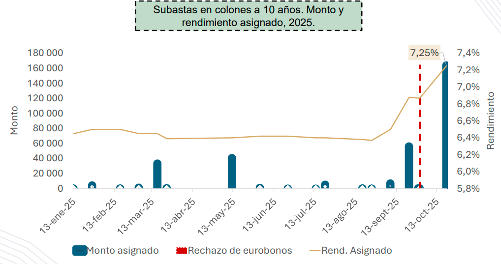 "El dato más impactante: si vemos la subasta en colones a 10 años, y analizamos lo que ocurrió después del rechazo a los eurobonos en las subastas que me llegan todas las semanas, vemos que la tasa de interés que se está pagando es de 7,25 %", detalló.