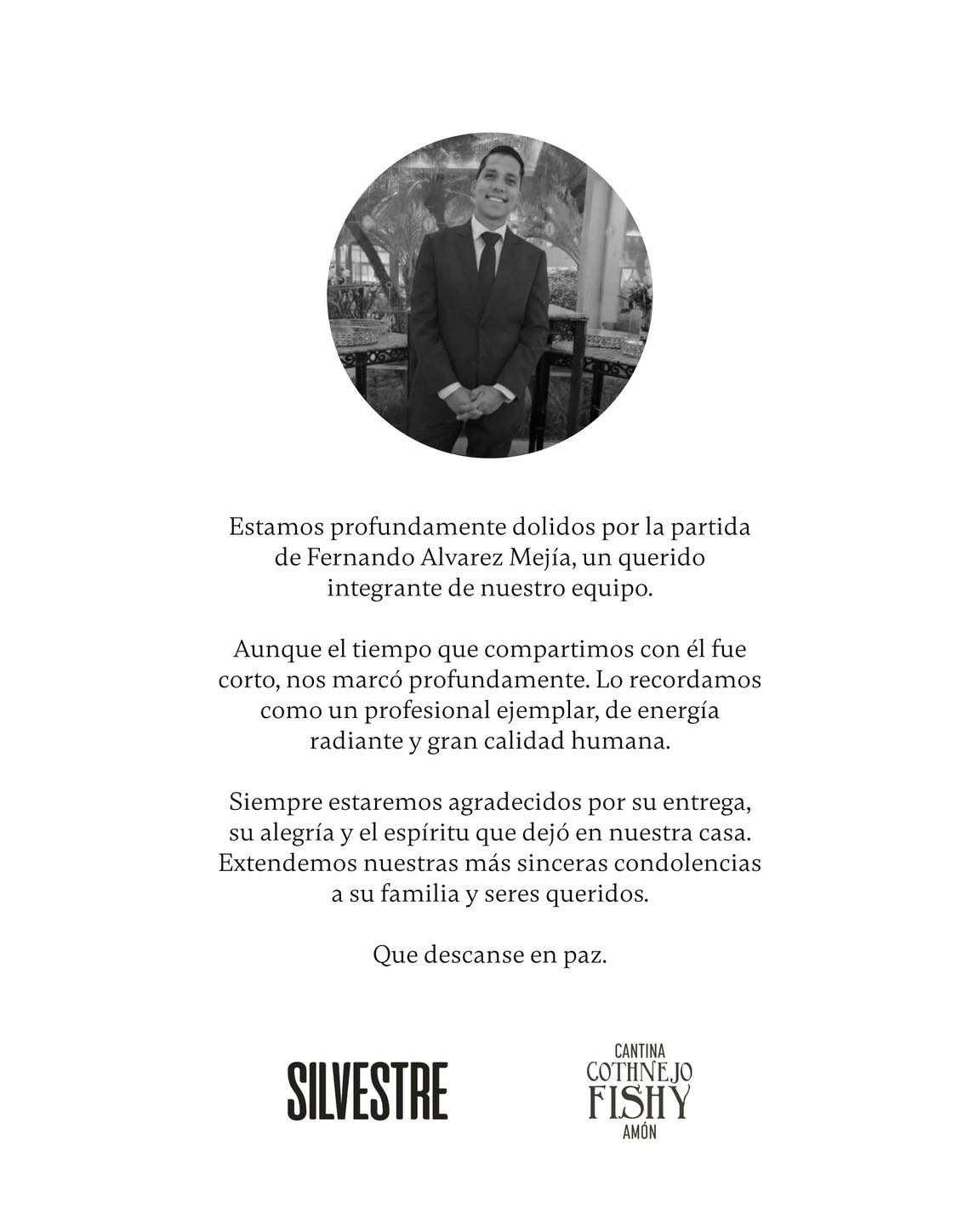 El Restaurante Silvestre, ubicado en Barrio Amón en San José, despidió con un emotivo mensaje a su extrabajador, Fernándo Álvarez Mejía, quien se encontraba desaparecido y fue hallado sin vida en el pasado jueves en las cercanías del Río Torres.