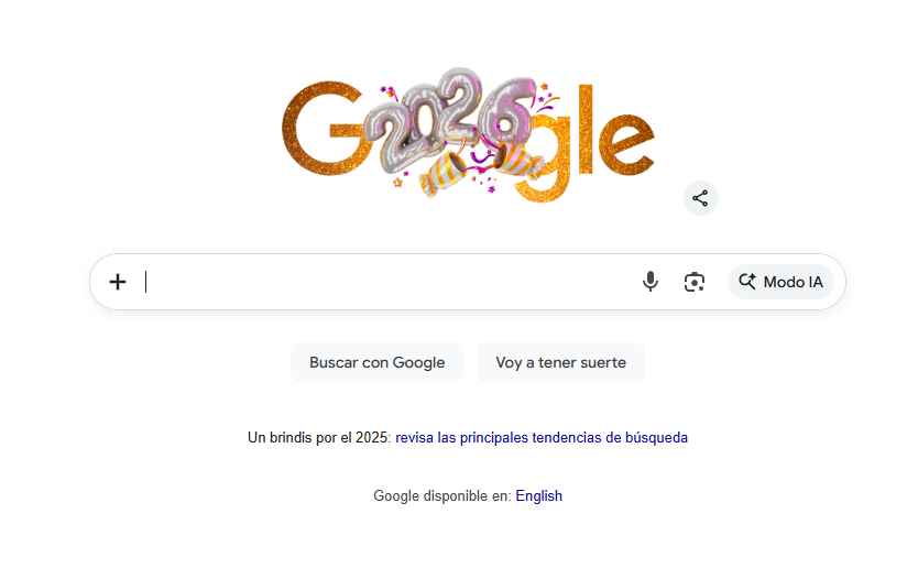 La imagen se encuentra en la página principal del buscador y, para este año, muestra tonos brillantes y dorados. Además, cuenta con una animación en la que el número 2025 cambia a 2026 en medio de una celebración.