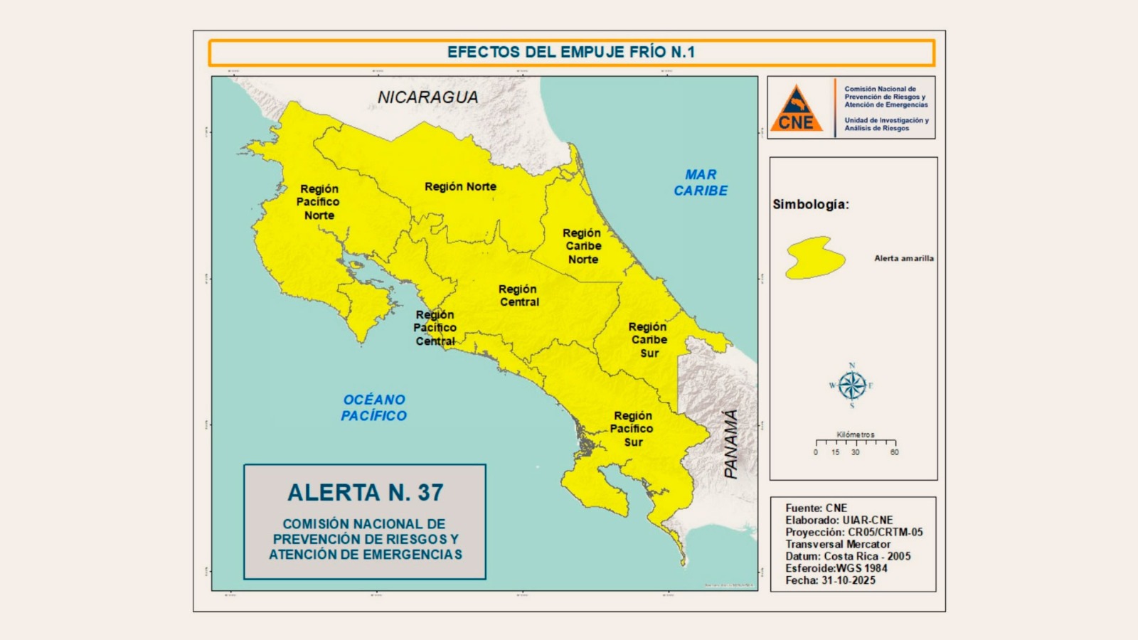 La Comisión Nacional de Emergencias (CNE) informó hace pocos minutos que se elevó la alerta amarilla para todo el país debido al desplazamiento del empuje frío #1 sobre el norte de Centroamérica y el Mar Caribe.