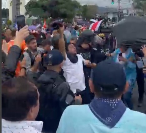 Tal como se observa en videos grabados por CR Hoy durante la protesta, un grupo de oficiales de la Fuerza Pública aprehendió al agricultor y lo trasladó en una patrulla hasta el Primer Circuito Judicial de San José.
